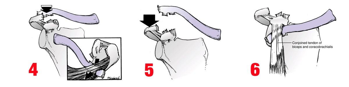 Concernant les luxations verticales (qui est la ‘’plus classique et visible ‘’), on observe une proéminence sur le haut de l’épaule qu’on connaît aussi sous le nom de ‘’note de piano’’. On pense souvent que lors de la déchirure totale, c’est la clavicule qui ‘’s’élève’’. Mais ceci est faux, puisque c’est l’omoplate qui descend car le complexe ligamentaire ne stabilise plus. L’omoplate est soumise à plusieurs forces (contraintes) directionnelles et certains puissants muscle du dos s’y attachent ; la résultante est donc une descente de l’omoplate par rapport à la clavicule.